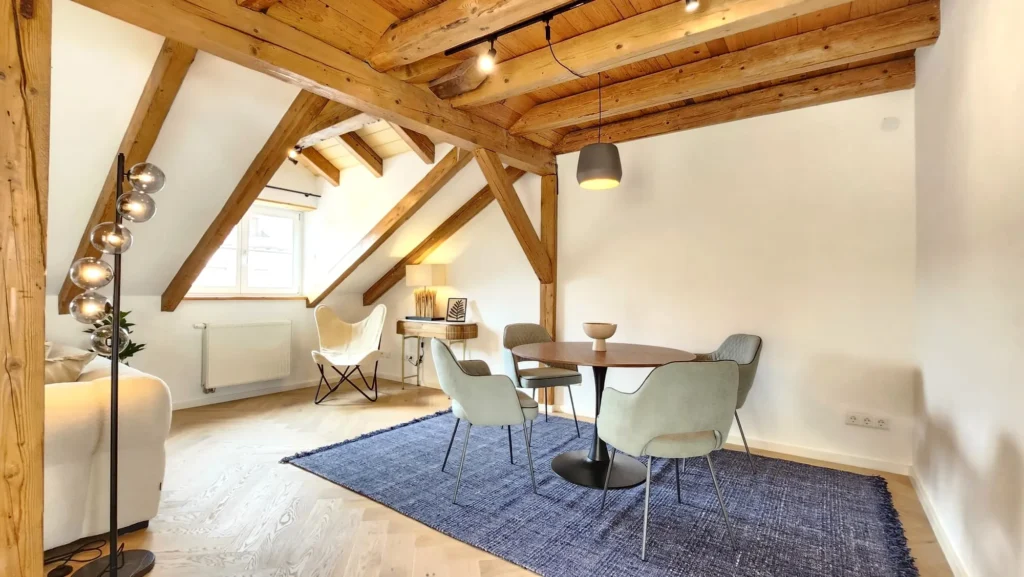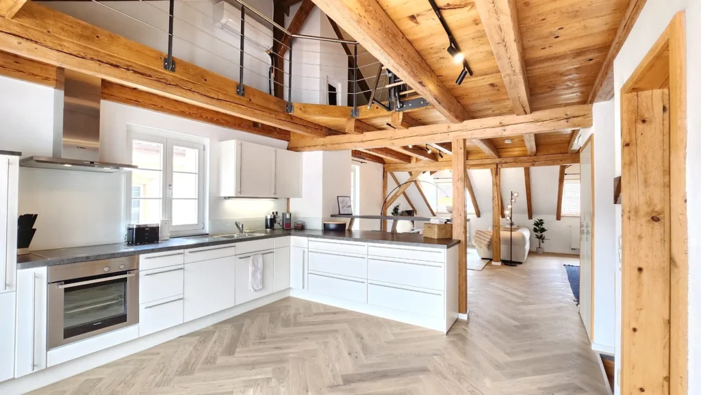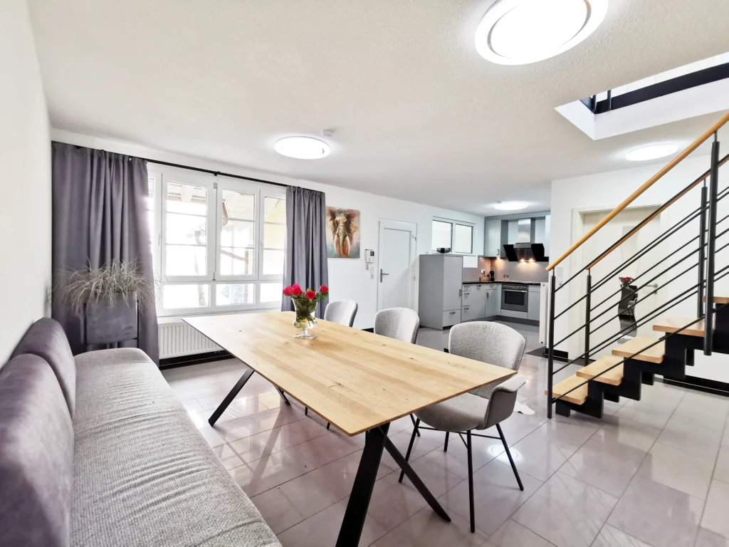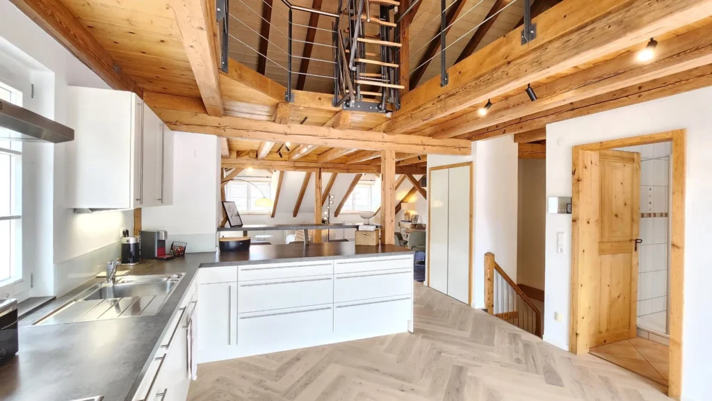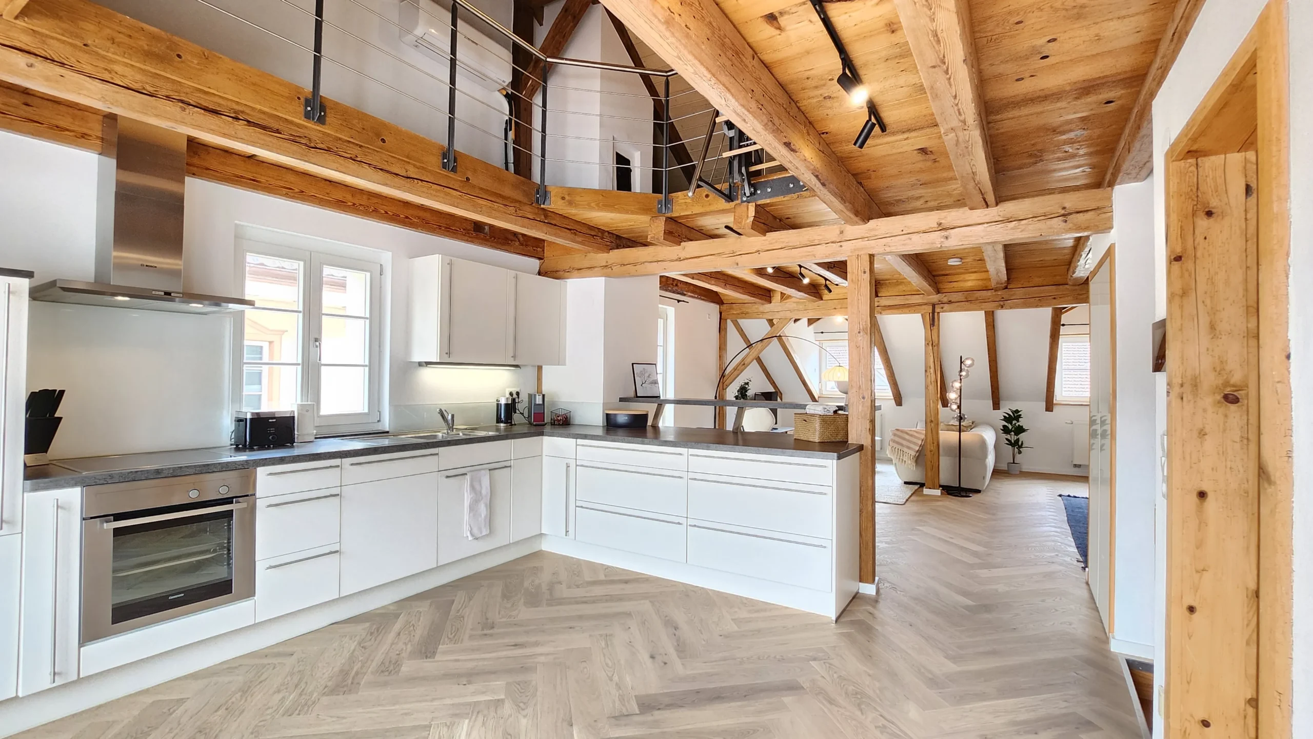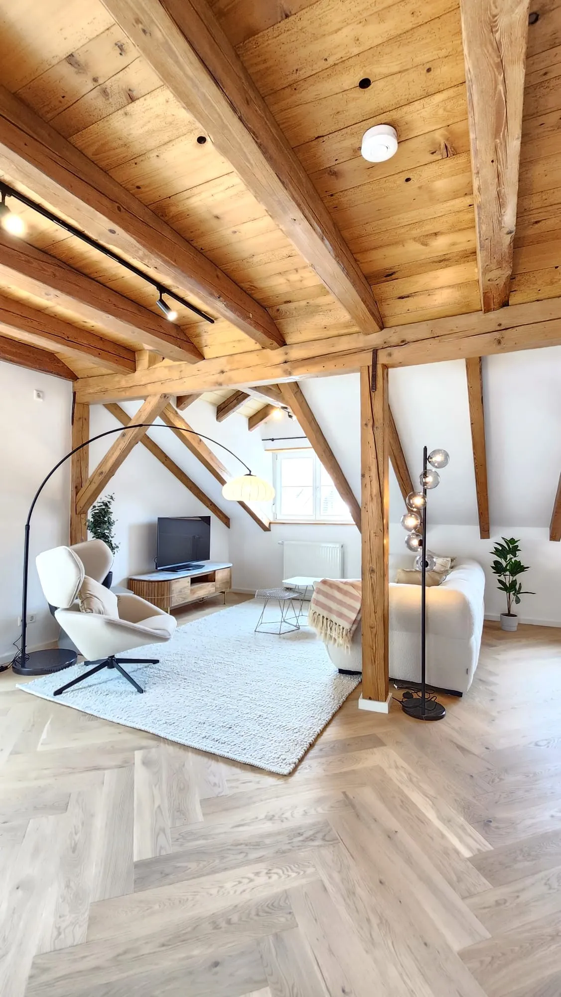 1 Wohn-/Esszimmer, 1 Schlafzimmer, 1 Badezimmer, 1 Küche, 1 Dachterrasse ca. 24 m², Fertiggestellt 2022, hochwertiges Mobiliar, Kombination Altholz & modernes Interior, offener Wohn-/Essbereich auf der oberen Ebene