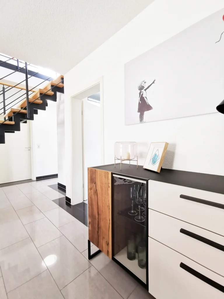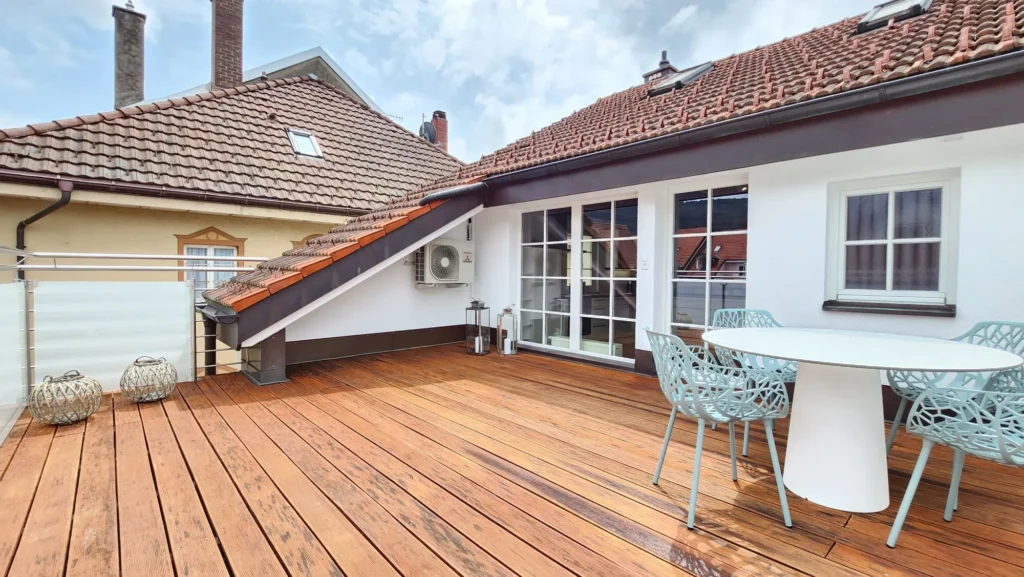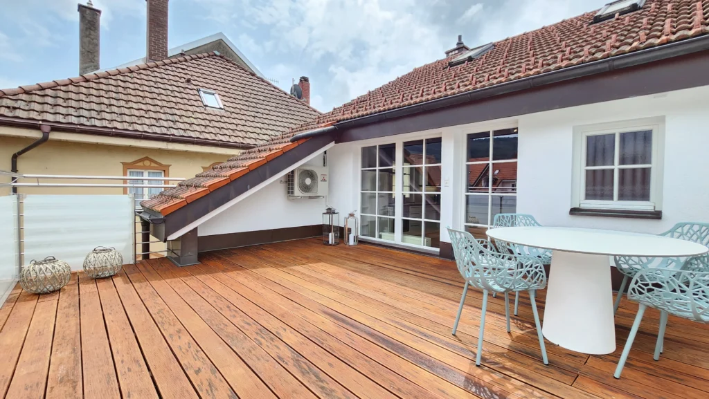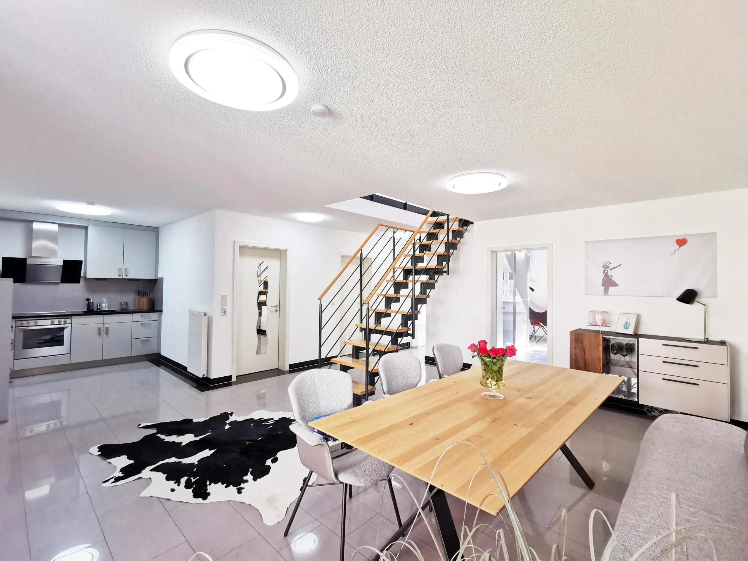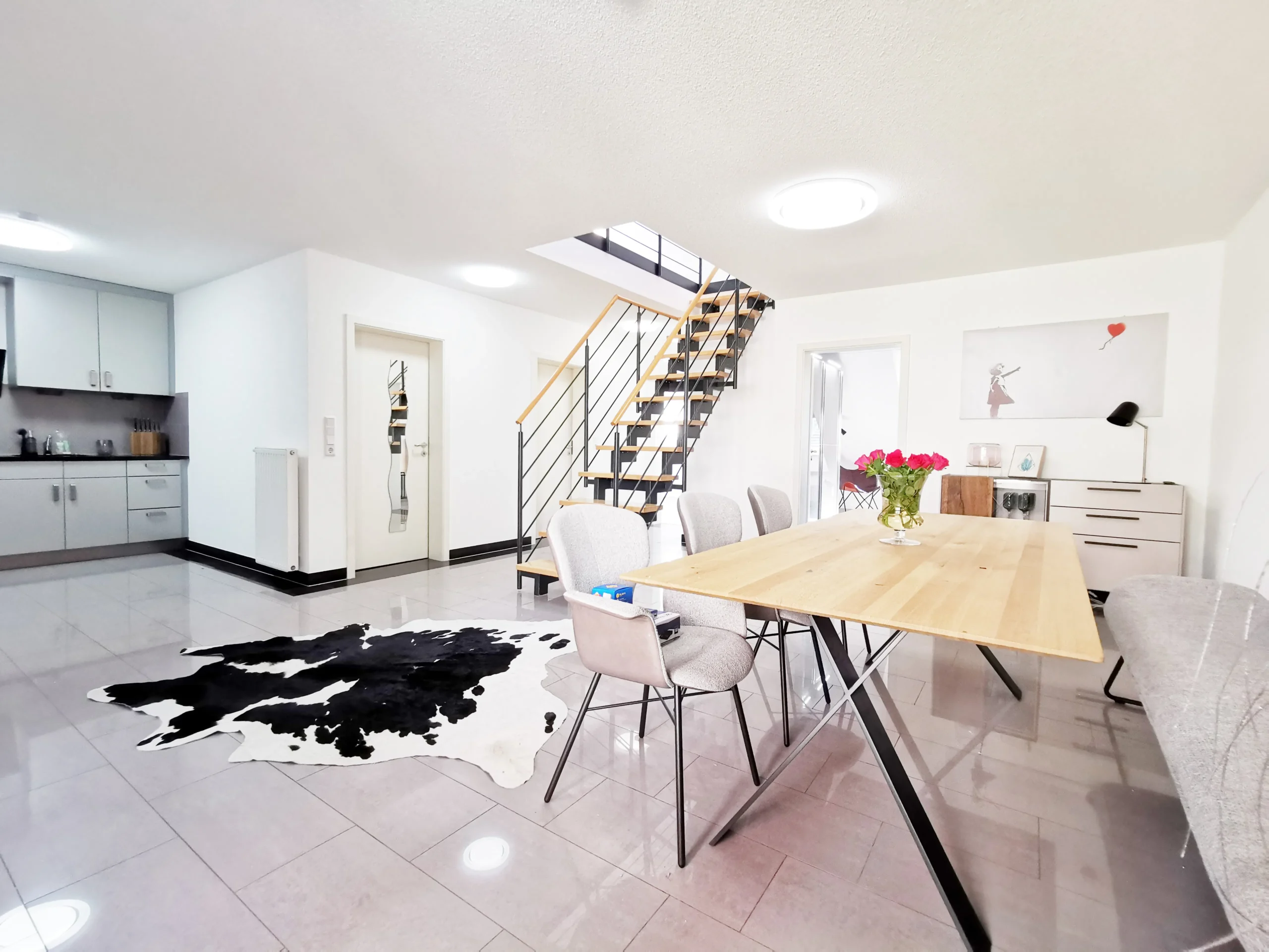 1 Wohn-/Esszimmer, 1 Schlafzimmer, 1 Badezimmer, 1 Küche, 1 Dachterrasse ca. 24 m², Fertiggestellt 2022, hochwertiges Mobiliar, Kombination Altholz & modernes Interior, offener Wohn-/Essbereich auf der oberen Ebene
