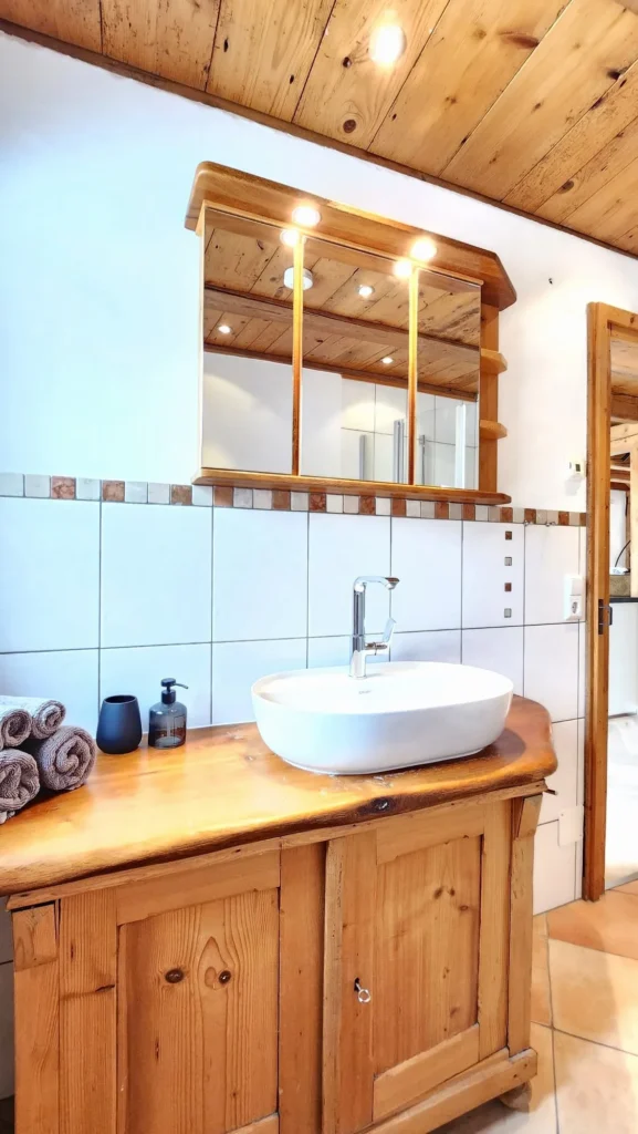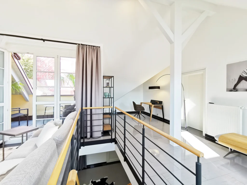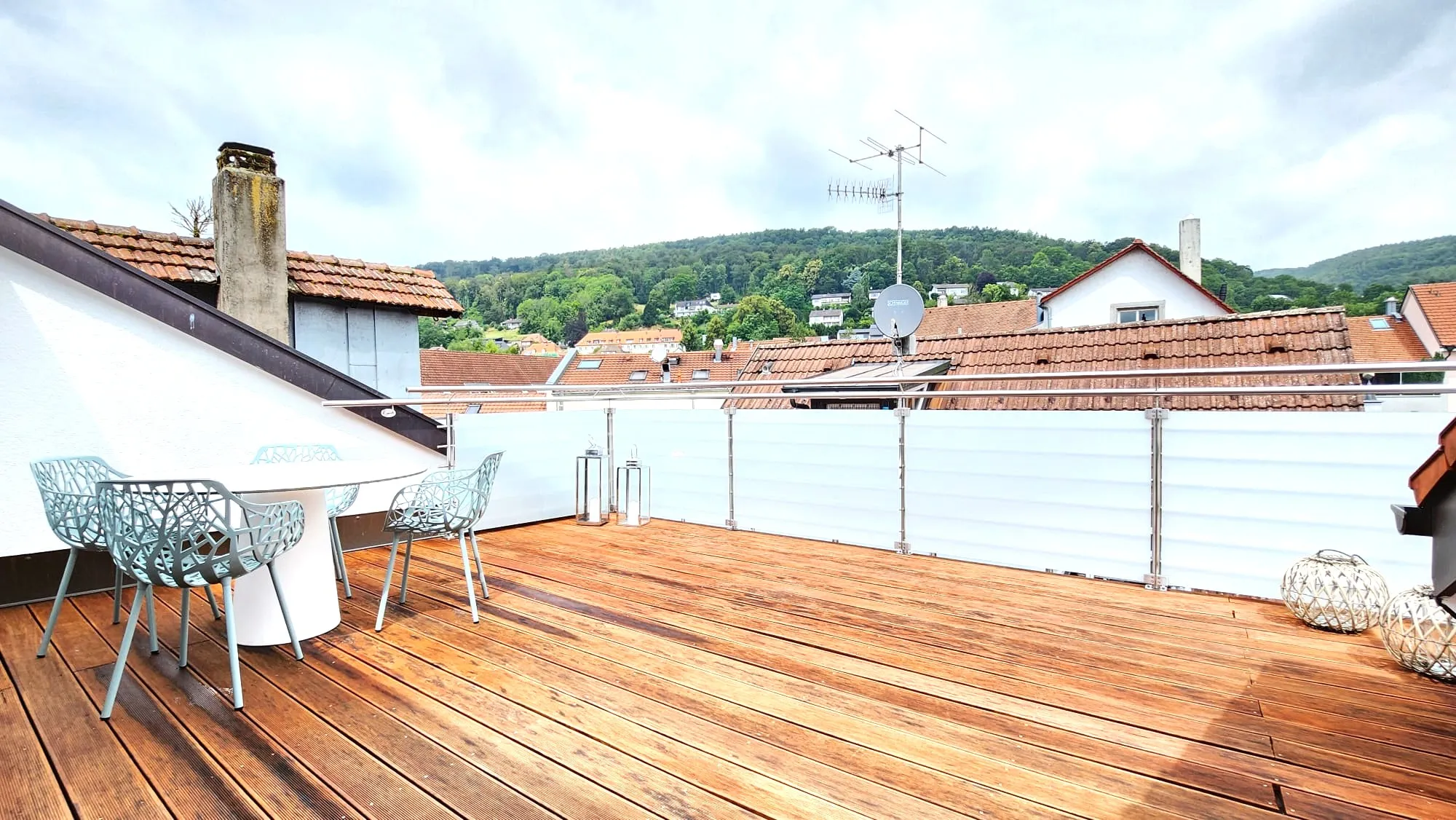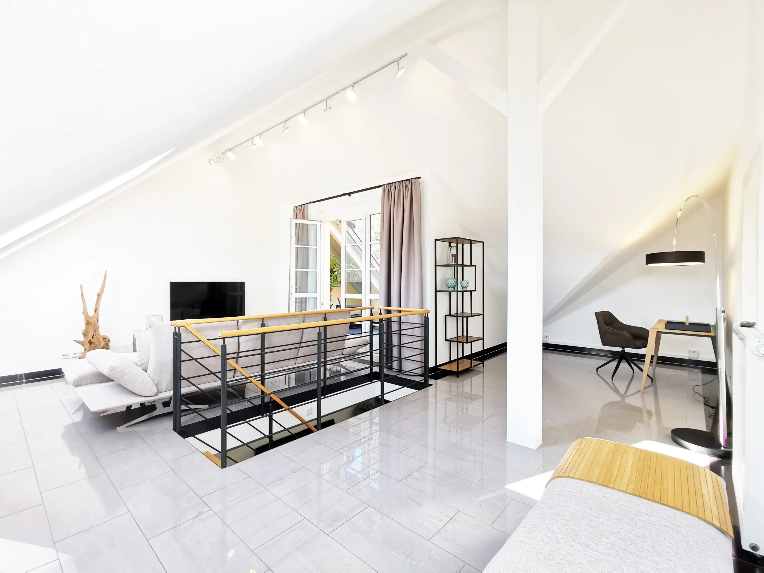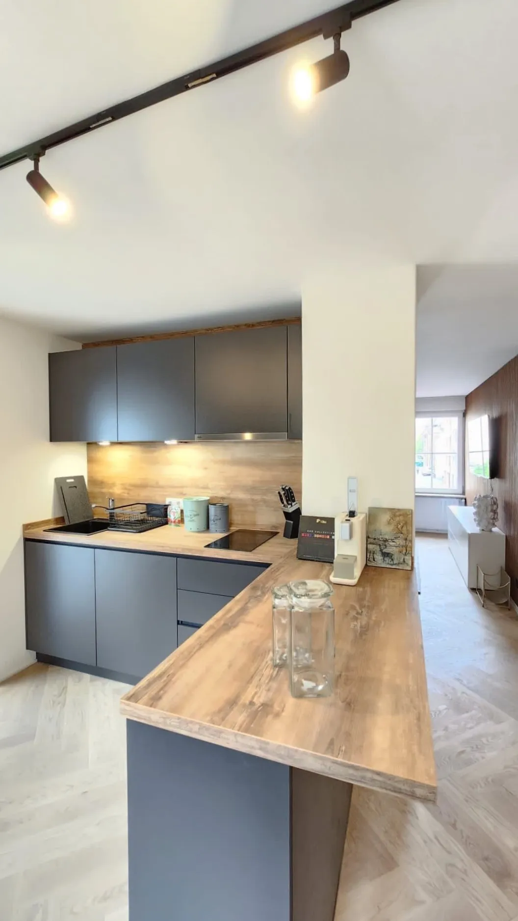 1 Wohn-/Esszimmer, 1 Schlafzimmer, 1 Badezimmer, 1 Küche, 1 Dachterrasse ca. 24 m², Fertiggestellt 2022, hochwertiges Mobiliar, Kombination Altholz & modernes Interior, offener Wohn-/Essbereich auf der oberen Ebene